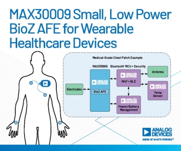 아나로그디바이스(ADI)가 저전력, 고성능의 소형 웨어러블 기기용 아날로그 프런트 엔드(AFE)를 출시하며 배터리 전원을 사용해 환자의 건강 상태를 평가하기 위한 기기 개발에 도움을 줄 것으로 기대된다.