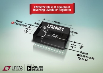 아나로그디바이스는 양극(+)의 입력 공급전압으로 -26.5V ~ -0.5V의 출력을 생성할 수 있는 비절연 인버팅 출력 μModule 레귤레이터 신제품 LTM4651을 출시했다고 밝혔다. LTM4651은 3.6V ~ 58V의 입력 전압 범위에서 동작하며, 15..