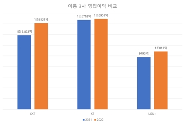 이통 3사가 발표한 2022년 연간 매출에 따르면, 작년 합산 영업이익은 약 4조 3835억원으로 역대급 실적을 기록했다. SKT는 2022년 연결 재무제표 기준 연간 매출 17조 3050억원, 영업이익 1조 6121억원, 순이익은 9478억원을 기록했다고 지난 8일 밝혔다. 이는 각각 매출 3.3%, 영업이익 16.2% 증가, 순이익 60.8% 감소한 수..