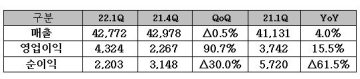 SKT는 연결 재무제표 기준 2022년 1분기 매출 4조 2,772억원, 영업이익 4,324억원, 순이익 2,203억원의 실적을 기록했다고 10일 밝혔다.
