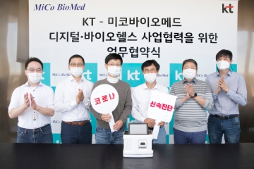 KT는 감염병 진단 및 바이오헬스 사업 협력을 위해 ‘미코바이오메드’와 MOU를 체결했다. 이 날 협약식에는 KT 미래가치TF 김형욱 전무, 디지털·바이오헬스분과 변형균 상무를 비롯해 미코바이오메드 김성우 대표이사, 시스템개발본부 김은섭 본부장 등이 참석해 미래 신성장동력으로서 디지털·바이오헬스 사업협력을 본격화 하기로 논의했다. 이번 양사 협력 배경에는 ..