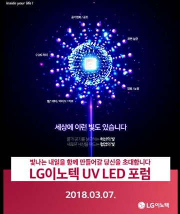 LG이노텍이 UV LED 기술 확보를 바탕으로 시장 확대를 위해 관련 분야 산업 생태계 조성에 적극 나선다는 방침이다. LG이노텍은 ‘UV LED 포럼’을 개최해 최신 기술과 제품을 이해하고 응용 분야까지 살펴볼 수 있는 기회를 제공한다. UV LED는 파장이 200~400나노미터(nm)로 짧은 빛인 자외선을 방출하는 반도체 광원이다. 세균·바..