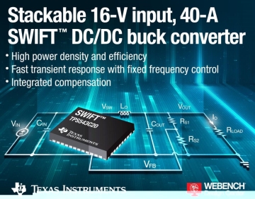 TI는 내장형 보상 최신 전류 모드(ACM) 제어 토폴로지를 채택함으로써 주파수 동기화가 가능한 업계 최초의 16V 입력, 40A 동기식 DC/DC 벅 컨버터를 출시한다고 밝혔다. TPS543C20 SWIFT 컨버터는 열 향상 소형 풋프린트 패키지로 저항이 낮은 최신 세대의 하이사이드 및 로우사이드 MOSFET을 통합함으로써 향상된 효율을 제공한..