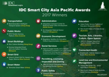IDC가 2017년 아시아 태평양 지역 우수 스마트시티 프로젝트 18개를 선정했으며, 최우수 수상국에는 뉴질랜드와 싱가포르가 선정됐다고 발표했다. 이들 국가는 총 14개 항목 중 각각 4개와 3개 부문 수상자가 나옴에 따라 2년 연속 스마트시티 최우수 수상국으로 선정되었다. 한국에서는 대전광역시의 '119 긴급구조서비스'가 ’공공안전' 부문을, ..