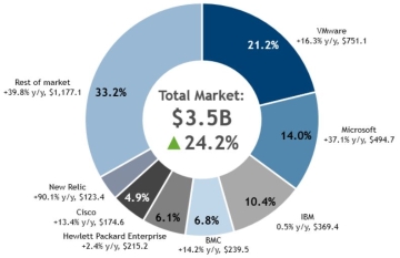 VMware (CEO: 팻 겔싱어)가 글로벌IT시장분석기관 IDC가 선정한 전세계 클라우드 시스템 관리 부문과 자동화 소프트웨어 부문에서 2016년 매출 기준 4년 연속 시장 점유율 1위를 차지했다. IDC가 발표한 ‘전세계 클라우드 시스템 관리 소프트웨어 시장 점유율, 2016: 모니터링 및 분석 증가의 해(Worldwide Cloud System..