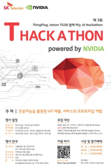 SK텔레콤이 엔비디아와 함께 국내 인공지능 생태계 활성화를 위해 오는 8월 26~27일 ‘제 3회 T해카톤(Hack-A-Thon)’ 대회를 개최한다. 2015년 이후 3회째를 맞은 올해 ‘T해카톤’의 가장 큰 특징은 기존 IoT에서 인공지능까지 주제를 확대했다는 점이다. 이번 대회에서 참가자들은 SK텔레콤의 ‘T API(Application Prog..