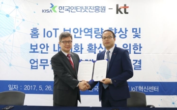 KT는 26일 경기 성남 판교 스타트업캠퍼스에서 한국인터넷진흥원(KISA)과 ‘홈 IoT 중소 협력사 보안역량 향상’에 관한 업무협력 양해각서(MOU)를 맺었다고 밝혔다. 이번 MOU 체결은 KISA에서 IoT 관련 업무를 맡고 있는 IoT 혁신센터에서 진행됐다. 홈캠 등 가정용 사물인터넷(IoT) 기기에 대한 해킹 우려가 높아지고 있다. 이러한 가운..