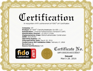 KT(회장 황창규, www.kt.com)는 생체인증에 관한 국제표준규격인 FIDO(Fast Identity Online) 인증을 획득했다고 6일 밝혔다.FIDO는 온라인 환경에서 생체인식기술을 활용한 인증방식으로 복잡한 패스워드 입력 없이 지문, 홍채, 얼굴, 음성 인식 등을 통해 빠르고 정확하게 사용자 인증을 할 수 있는 것이 특징으로 FIDO 얼라이언스..