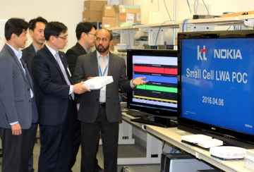 KT(회장 황창규, www.kt.com)는 노키아와 차세대 LTE 기술로 주목 받는 LWA(LTE-WiFi Aggregation, LTE-WiFi 병합전송) 기술 기반의 스몰셀(초소형 기지국) 시연에 세계최초로 성공했다고 8일 밝혔다.LWA란 면허대역인 LTE 주파수와 비면허대역인 WiFi 주파수를 단말이 아닌 기지국에서 병합하여 전송하는 3GPP 표준 기..