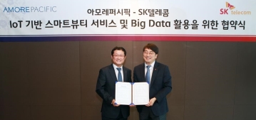 SK텔레콤과 아모레퍼시픽은 23일, '사물인터넷(IoT) 기반 스마트뷰티 서비스 및 빅데이터 활용’을 위한 상호양해각서(MoU) 체결식을 가졌다고 밝혔다. MoU를 시작으로, 양사는 SK텔레콤의 IoT 기술력과 아모레퍼시픽의 연구 개발 역량 및 뷰티 사업 노하우를 모아 새로운 스마트뷰티 서비스를 개발할 계획이다.