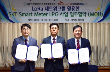 SK텔레콤이 IoT 기반의 LP가스 원격 검침 및 안전관리를 추진한다. SK텔레콤은 10일 서울 여의도 중소기업회관에서 한국LP가스판매협회중앙회 및 코리센과 IoT 전용망인 로라(LoRa) 네트워크를 기반으로LP가스의 사용량 원격 검침 및 잔류량 체크, 사용 패턴 바탕의 안전관리 솔루션 ‘스마트미터LPG’를 적용하기로 협약(MoU)을 체결했다.