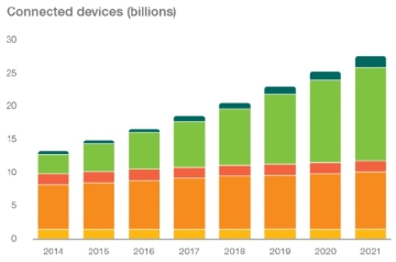 2015년에서 2021년 사이에 셀룰러 IoT는 가장 높은 성장률을 보일 것이며, IoT 커넥티드 기기의 수는 연평균 23%로 성장할 것으로 예상된다. 2021년까지 약 280억 개의 커넥티드 기기가 생겨나고 이 중 IoT 기기는 약 160억 개에 달할 것이다. 서유럽에서는 2021년까지 IoT기기의 수가 4배까지 증가하며 IoT시장을 이끌 것이다...