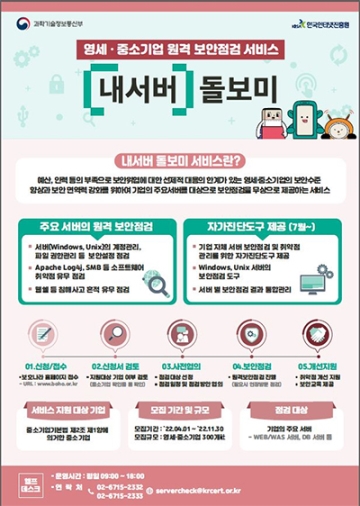 과기부는 KISA 함께 중소기업의 기업 서버의 보안취약점을 원격에서 점검해주는 ‘내서버 돌보미’ 서비스를 KISA 보호나라 누리집(boho.or.kr) ‘에서 시작한다.