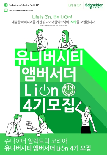 에너지 관리·자동화 분야의 디지털 혁신을 선도하고 있는 글로벌 기업 슈나이더 일렉트릭 코리아 (대표 김경록)가 대학생 홍보대사 ‘유니버시티 앰버서더 LiOn 4기’를 2월 4일(금)까지 모집한다. 1차 서류전형과 2차 온라인 면접 전형을 거쳐 최종 20명을 선발한다. ..