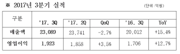 삼성SDS는 잠정 실적 공시를 통해 3분기 매출액은 2조 3,089억원, 영업이익은 1,923억원을 각각 기록했다고 밝혔다. 지난해 3분기 대비 매출은 15.4%, 영업이익은 12.7%로 모두 증가했다. 매출액은 IT서비스와 물류BPO 모두 전년 동기 대비 ..