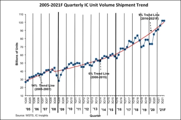 팬데믹에 따른 전자 기기 수요 증가로 2021년 집적회로(IC) 출하량이 전년보다 21% 급증해 2010년 이후 최대치를 기록할 전망이다. IC 인사이츠는 2019년에 IC 출하량이 6% 감소하고, 2020년에 8% 증가한 후, 올해는 21% 증가할 것으로 예측했다.
