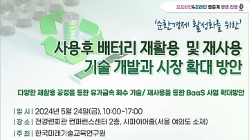 한국미래기술교육연구원이 2024년 사용후 배터리 산업의 제반 트렌드와 기술 개발 방향은 물론 정책과 국내외 산업 및 시장 동향 등의 정보를 공유하며 그에 따른 전략을 제시하는 장을 마련한다.