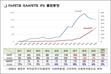 반도체 미세화 공정 기술을 주도했던 핀펫 기술은 지고, 게이트올어라운드(GAA) 기술이 새롭게 뜨고 있다. 특허청이 주요 5개국의 특허를 분석한 결과, 반도체 미세화 공정 기술의 주력인 핀펫 기술 특허 신청 수가 지난 2017년부터 내림세로 전환됐지만, GAA 기술은 ..