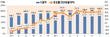 반도체, 디스플레이, 휴대폰, 컴퓨터 등 정보통신산업(ICT) 전반의 높은 수출 호조 지속으로 7월 ICT 수출이 4개월 연속 30%대 증가율을 기록하는 높은 성장세를 보였다.