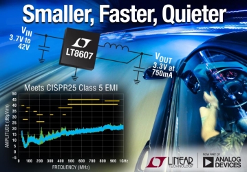 아나로그 디바이스는 750mA, 42V 입력의 동기식 스텝다운 스위칭 레귤레이터 신제품 LT8607을 출시했다. 신제품의 독창적인 동기식 정류 토폴로지는 2MHz의 스위칭 주파수에서 93%의 변환 효율을 제공할 뿐 아니라, 설계자가 매우 컴팩트한 풋프린트의 솔루..