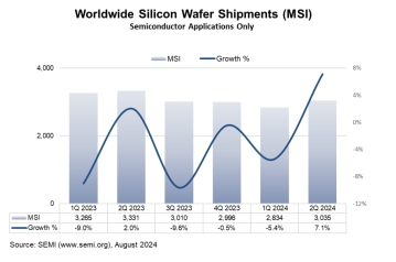 글로벌 전자 산업 공급망을 대표하는 산업 협회인 SEMI에 따르면 2024년 2분기의 전 세계 실리콘 웨이퍼 출하량이 30억3,500만제곱인치로 전년동기인 33억3,100만제곱인치에 비해 8.9% 감소했지만, 직전분기대비 7.1% 증가했다.