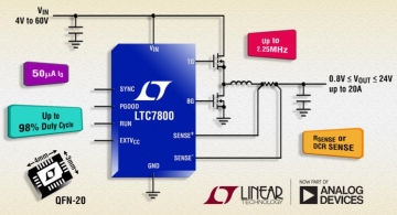 아나로그 디바이스는 소형 회로 사이즈 및 높은 전력 밀도에서도 이용할 수 있도록 최대 2.25MHz에서 동작이 가능한 동기식 스텝다운 DC/DC 컨트롤러 LTC7800를 출시했다고 밝혔다. 이 제품의 최소 온타임(on-time) 은 45ns로 24VIN ~ ..