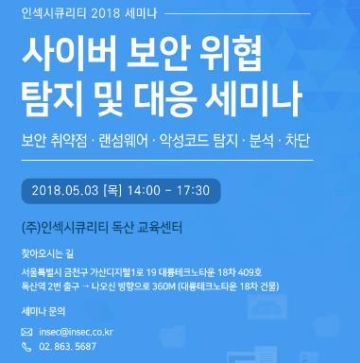 인섹시큐리티는 오는 5월 3일(목)에 금천구 독산동 인섹시큐리티 독산 교육센터에서 기업 보안 담당자를 대상으로 기업 인프라 및 시스템에 대한 랜섬웨어 및 악성코드 탐지, 보안 취약점 진단 및 대응 방안을 소개하는 ‘사이버 보안 위협 탐지 및 대응 세미나’를 개최한다..