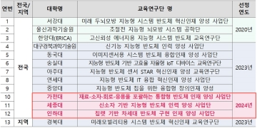 가천대, 인하대, 세종대가 4단계 두뇌한국21(BK21) 혁신인재 양성사업 지능형 반도체(시스템 반도체 포함) 분야에 추가선정되며, 지능형 반도체 분야 교육연구단이 13개로 늘어났다.