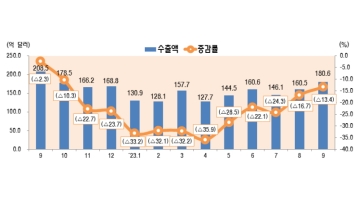 반도체 수출이 올해 1분기 저점을 기록한 후 수출 감소율이 점진적으로 개선되고 있는 가운데 9월 ICT 수출이 180억6,000만달러를 기록해 전년동월대비 13.4% 감소한 것으로 분석됐다.