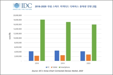 한국IDC가 최근 발간한 국내 스마트 커넥티드 시장 보고서에 따르면, 2019년 국내 스마트 커넥티드 디바이스의 출하량은 2,413만대로 전년 대비 2.0% 감소했다. PC와 태블릿은 각각 7.2%, 12.2% 성장했지만, 스마트폰은 5.9% 감소한 것으로 나타났다...