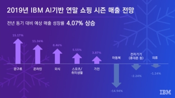 IBM이 AI를 활용해 연말시즌 쇼핑 매출을 전망한 결과 전년 대비 4% 증가할 것으로 나타났다. 이는 블랙프라이데이에서 크리스마스로 이어지는 기간 동안 미국 소비자 7,782명을 대상으로 전미소매협회가 설문조사한 결과와 일치했다. 장난감 매출이 지난해보다 15.17%..