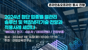 산업교육연구소(이하 산교연)이 전자장치, 전기차, 데이터센터 등의 폭발적인 증가로 필수적으로 동반되는 열관리 기술의 중요성 또한 증가함에 따라 열관리 시스템 현주소와 기술개발 방향 등을 알아볼 수 있는 세미나를 개최하고 정보를 공유한다.