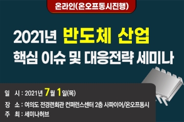 글로벌 반도체 수급 불안정 지속으로 반도체에 관한 관심이 그 어느 때보다 뜨거운 상황이다. 세미나허브는 오는 7월 1일(목), 서울 여의도 전경련회관에서 2021년 반도체 산업 핵심 이슈 및 대응전략 세미나를 온오프라인 동시 진행한다.
