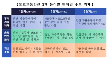경찰청이 자율주행 상용화 시기를 3단계로 구분하고, 각 단계에 필요한 총 28개 과제를 △평가검증체계 △운행 안전관리 △기반 구축 3개 분야로 나누어 체계적으로 추진한다.