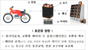 전기이륜차 배터리의 충전시간(3~4시간), 가격(100~150만원), 제조사별 상이한 규격 등의 문제점으로 인해 교환형 배터리 스테이션 표준화 필요성이 제기됨에 따라 산업부는 전기 이륜차 교환형 배터리 충전스테이션(3종) 및 전기이륜차(1종)에 대하여 국가표준을 제정했..