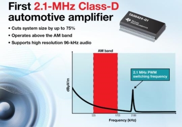 TI는 자동차 애플리케이션용으로 특별히 설계된 2.1MHz 클래스 D 오디오 증폭기를 최초로 출시했다. 96kHz 고해상도 디지털 입력을 지원하는 소형의 TAS6424-Q1은 자동차 인포테인먼트 애플리케이션에서 왜곡이 낮은 고성능 오디오 품질을 구현한다.