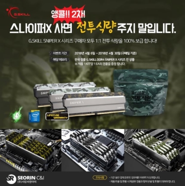 서린씨앤아이가 지스킬사의 카모 플라쥬 패턴을 특징으로 갖고 있는 DDR4 스나이퍼 X 시리즈 구매 시 전투 식량을 100% 증정하는 이벤트를 2차 진행한다. 이번 행사는 지스킬사의 DDR4 스나이퍼 X 시리즈 전 제품 구매 시 1인 간편 식량인 소고기 맛 고추장..