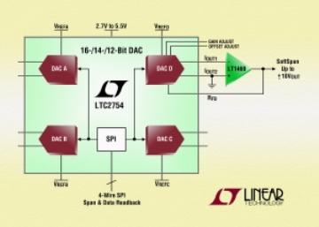 리니어 테크놀로지 코리아(대표 홍사곽, www.linear.com)는 ±1LSB INL(integral nonlinearity) 및 DNL(integral nonlinearity)을 달성하는 쿼드 16비트 전류 출력 DAC(제품명: LTC2754-16)를 출시했다고 발..