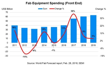 ?SEMI 가 2018년 2월 28일에 발표한 세계 팹 전망 보고서에 따르면,2019년 반도체 팹 장비 투자는 5% 성장을 하며, 4년 연속 주목할 만한 성장을 보일 것이라 전망했다. SEMI는 삼성이 2017년에 비해서는 조금 줄어든 수치이지만 2018년과 2..
