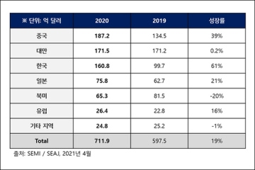2020년 전 세계 반도체 장비 매출액 19% 증가한 712억달러로 역대 최대 규모를 경신했다. 한국은 무려 61% 성장한 160억8,000만달러로 전 세계 모든 지역에서 가장 높은 증가세를 보였다.