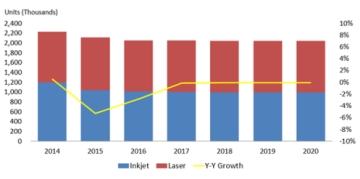 한국IDC(대표 홍유숙,)가 발간한 국내 프린터 및 복합기 시장 전망 보고서에 따르면, 지난해 국내 프린터 및 복합기 시장은 전년 대비 5.3% 역성장한 것으로 집계되었다. 메르스 여파와 경기 부진으로 잉크젯이 전년 대비 12.8% 감소하면서 전체 시장의 하락을 야기했..
