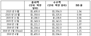 국제반도체장비재료협회(SEMI)가 발표한 4월 BB율 보고서에 따르면, 북미반도체장비업체들의 2016년 4월 순수주액(3개월 평균값)은 15억 9천만 달러이며, BB율은 1.10이다. BB율은 수주액을 출하액으로 나눈 값으로, BB율이 1.10라는 것은 출하액 100달..