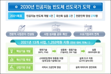 AI 반도체는 학습, 추론 등 AI 구현에 특화된 고성능, 저전력 시스템반도체다. 과기정통부는 관계부처 합동으로 2020년 10월 발표한 AI 반도체 발전전략’의 후속 조치로 AI 반도체 지원사업에 본격적으로 착수한다. 13개 사업에 총 1,253억 원이 투입되는 올해..