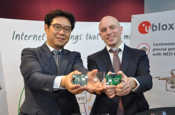 유블럭스(u-blox)는 초소형 초정밀 실시간 이동 측위(GNSS RTK) 모듈인 'NEO-M8P'의 양산용 제품을 오는 3분기 초에 한국에 본격 공급한다고 18일 밝혔다. 이를 위해 유블럭스는 18일 서울 코엑스 컨벤션센터 컨퍼런스룸에서 유블럭스 본사 피터 페어..
