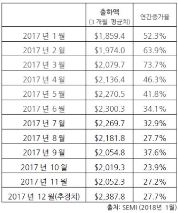 국제반도체장비재료협회(SEMI)는 12월 북미반도체 총 장비출하액이 23억 9천만 달러라고 발표했다. SEMI는 북미지역의 반도체 장비제조사들의 출하액을 3개월 평균치로 보고서에 발표한다. 지난 11월 20억 5천만 달러와 비교해서는 16.3% 증가했고, 전년도..