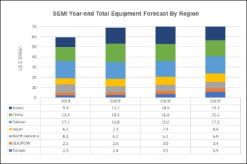 2020년 전 세계 반도체 장비 매출액이 75조252억 원을 달성하며 역대 최대치를 기록할 전망이다. 또한, 성장세가 지속되며 2022년에는 82조8,653억 원을 기록할 것으로 예상된다. 한국은 2021년과 2022년에 메모리와 로직 반도체에 대한 투자 강화로 2년 ..