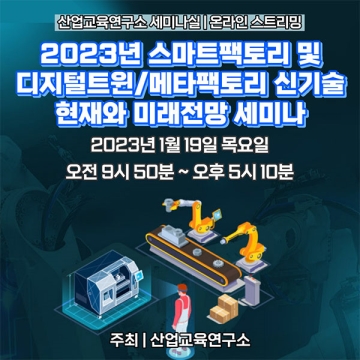 산업교육연구소는 오는 1월 19일, ‘2023년 스마트팩토리 및 디지털트윈/메타팩토리 신기술 현재와 미래전망 세미나’를 온·오프라인 동시 개최한다. 세미나는 오전 9시 50분에 시작, 오후 5시 10분까지 진행된다.