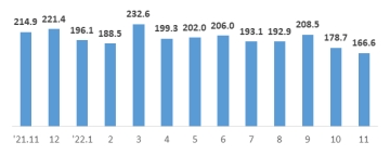 과학기술정보통신부는 2022년 11월 ICT 수출이 전년 동월 대비 22.5 % 감소한 166.6억불을 달성했고, 무역수지는 38.2억불 흑자를 달성했다고 밝혔다.