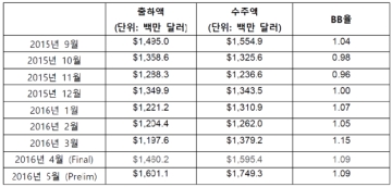 국제반도체장비재료협회(SEMI)가 발표한 5월 BB율 보고서에 따르면, 북미반도체장비업체들의 2016년 5월 순수주액(3개월 평균값)은 17억 5천만 달러이며, BB율은 1.09이다. BB율은 수주액을 출하액으로 나눈 값으로, BB율이 1.09라는 것은 출하액 100달..