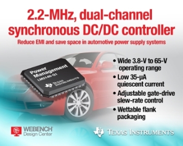 TI (대표이사 켄트 전)는 오토모티브 인포테인먼트 및 하이엔드 클러스터 전원 공급장치 시스템과 같은 고전압 DC/DC 스텝다운 애플리케이션의 EMI(electromagnetic interference)와 고주파 잡음을 크게 줄일 수 있는 고유 기능을 통합한 2.2MH..